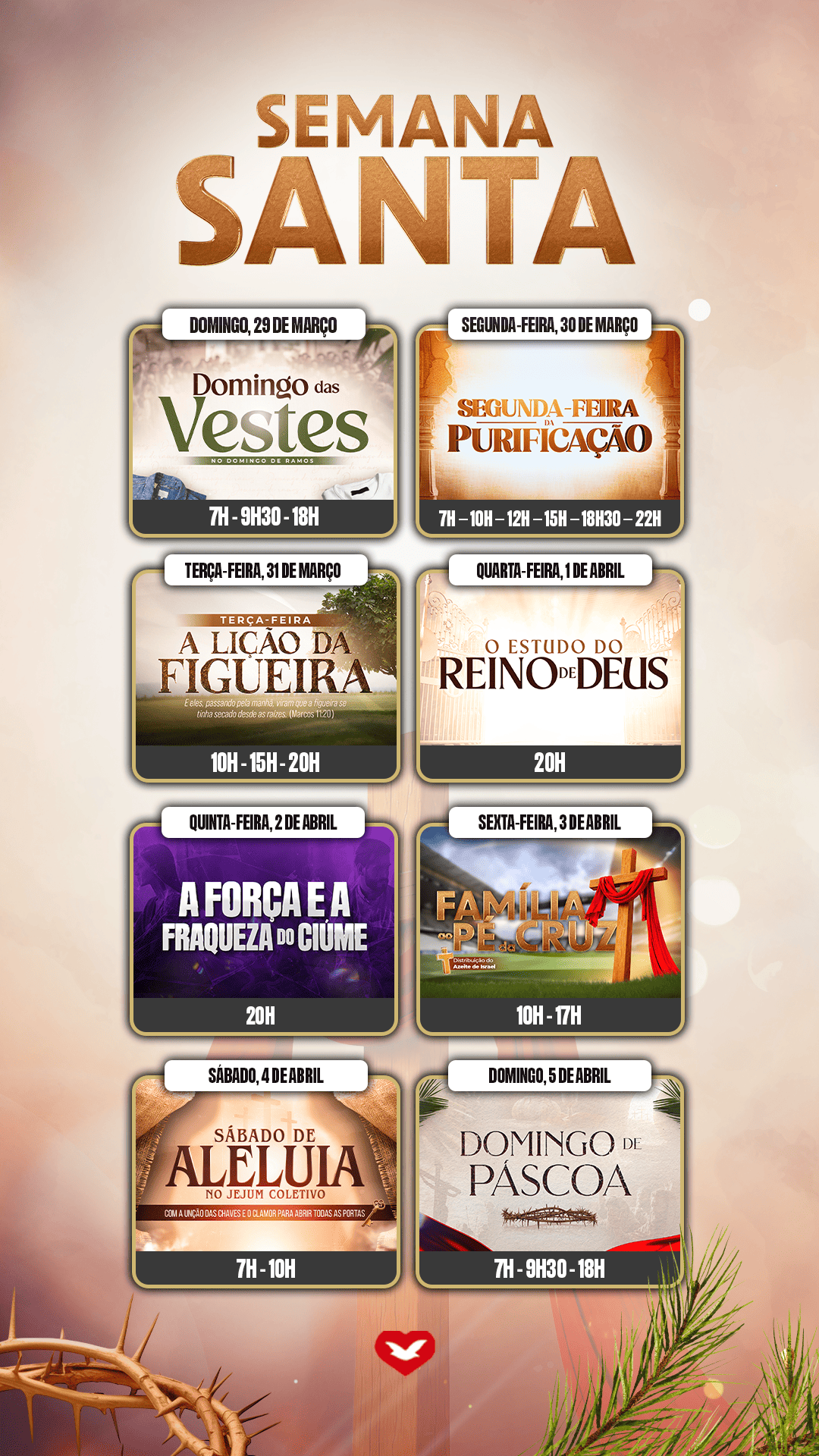 O Bispo Renato Cardoso anunciou, durante o “Encontro com Deus“, realizado no Templo de Salomão, no dia 29 de março, uma semana de consagração intensiva, que culminará no evento “A Família ao Pé da Cruz” na Sexta-feira Santa. O objetivo é desviar o olhar do que não importa e focar no sacrifício de Jesus.