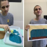 - “Procuro trazer o máximo de elementos para eles terem experiências diferentes e criarem novas memórias. E a seleção do artista brasileiro Gustavo Rosa foi uma surpresa, já que além de quadros ele também fez bastante esculturas. Fiz uma pesquisa grande e, conversando com as auxiliares, a gente procurou ver qual obra se encaixava melhor de acordo com cada aluno e necessidade. Procuramos adaptar materiais e trazer textura para eles conseguirem tocar na obra e sentir. Fizemos bastante coisa com materiais recicláveis como papelão e rolinho de papel higiênico. Porque aí não tinha perigo do aluno se machucar, de quebrar e ainda conseguia ficar livre para pintar”, relatou.