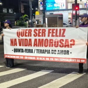 A cada sinal vermelho, os auxiliares estendiam faixas com as mensagens “Quer ser feliz na vida amorosa?” e “Como ser feliz no amor?”, além de oferecerem palavras voltadas às áreas sentimental e familiar.