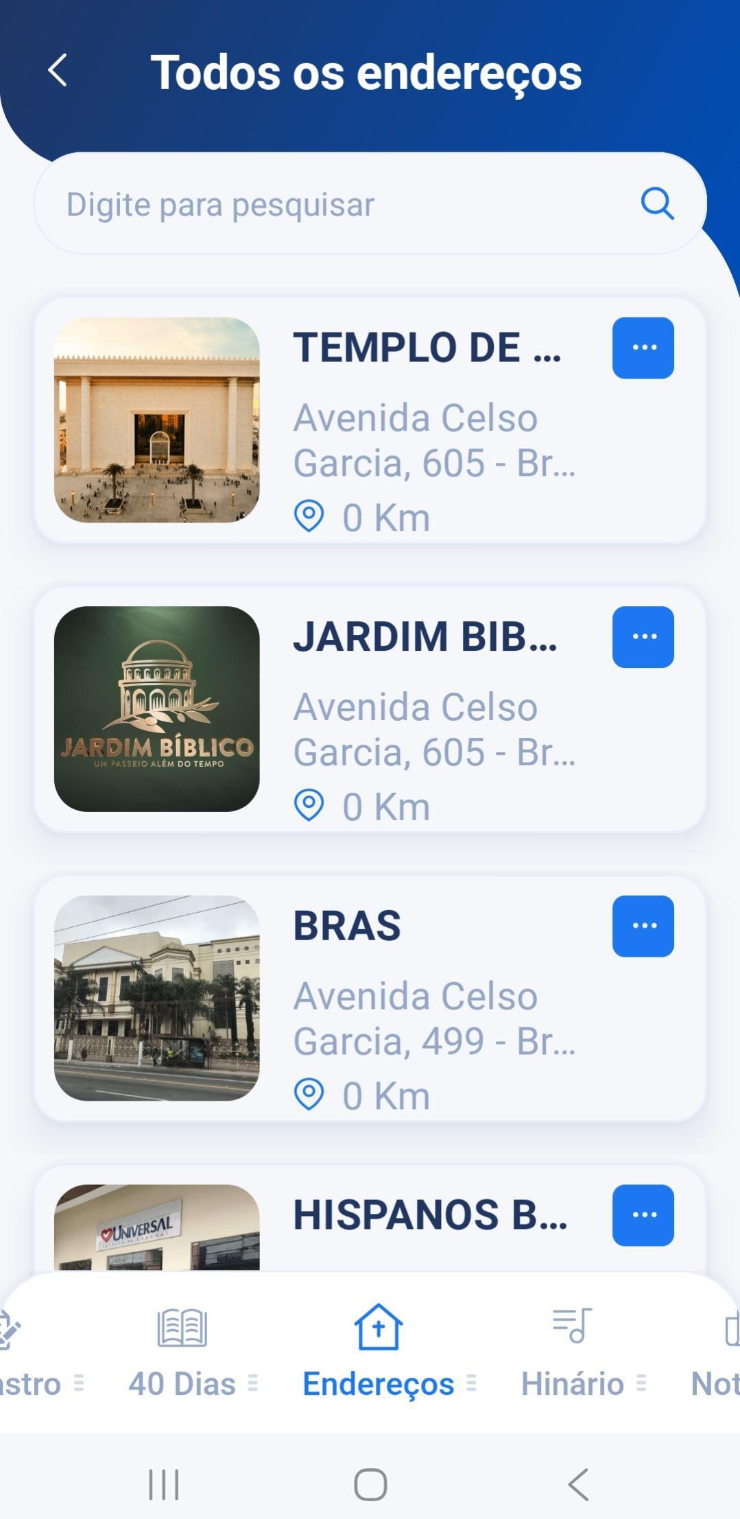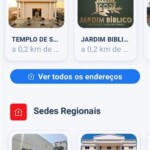 Basta apenas abrir a ferramenta “Endereços’ no app — localizada no menu inferior (ao pé da página, conforme na foto abaixo) — e ela já vai mostrar os templos mais próximos ao seu local. Ademais, você pode também fazer a busca na lupa.