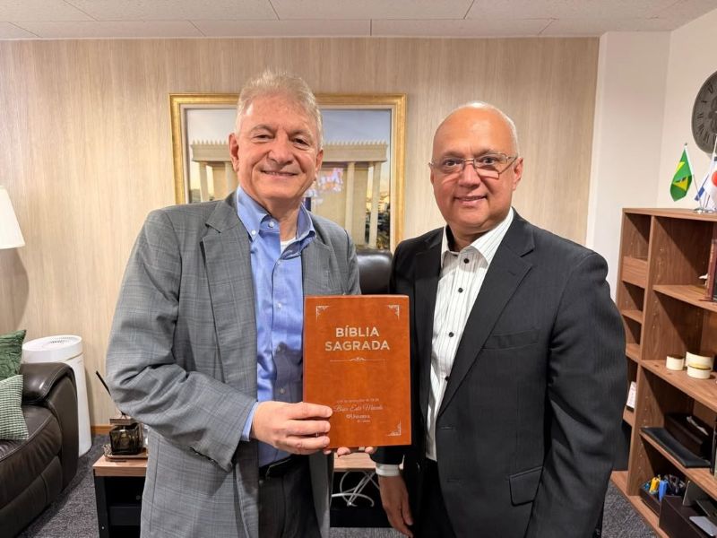 Na ocasião, o cônsul (à esquerda) foi presenteado com uma Bíblia com anotações do Bispo Edir Macedo. O gesto representou a fé como fonte de sabedoria e direção para todos os momentos da vida.