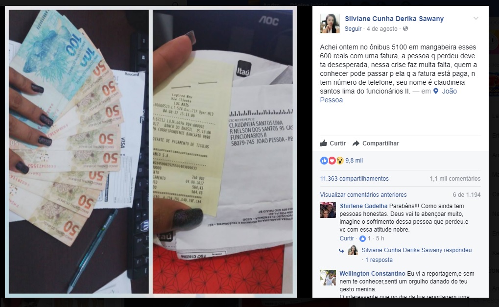 O caso aconteceu no último dia 3, em João Pessoa, Paraíba. Quando ia para a empresa onde trabalha como telefonista, Silviane encontrou 600 reais e uma fatura. No dia seguinte, saiu mais cedo de casa para ter tempo de passar no banco e liquidar a conta. Depois, postou a seguinte mensagem no Facebook: