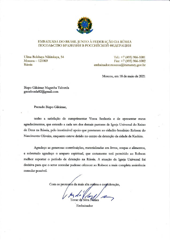 Nesta terça-feira (18), o embaixador do Brasil na Rússia, Tovar da Silva Nunes, enviou uma carta de agradecimento à Igreja Universal do Reino de Deus daquele país, pelo apoio prestado ao motorista Robson Nascimento de Oliveira, que estava preso no Centro de Detenção da cidade de Kashira.