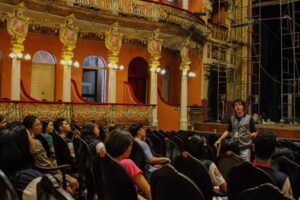 Durante o passeio, o guia compartilhou conhecimentos sobre a construção do teatro e explicou como ele vem sendo preservado em sua originalidade ao longo do tempo.