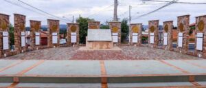 O monumento central é composto por 12 colunas, representando as tribos de Israel, e uma Bíblia aberta que destaca os Dez Mandamentos e a passagem de João 14:6, em que Jesus declara: