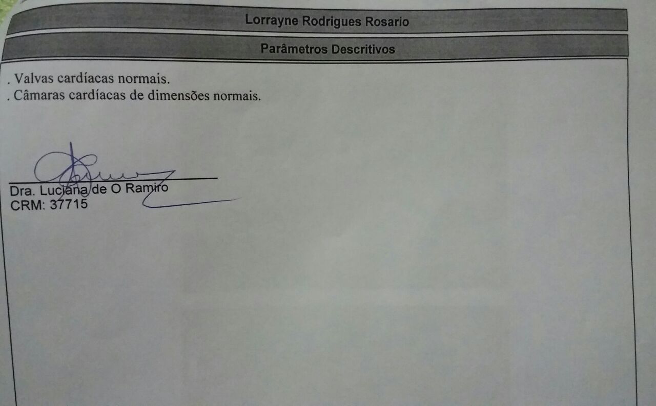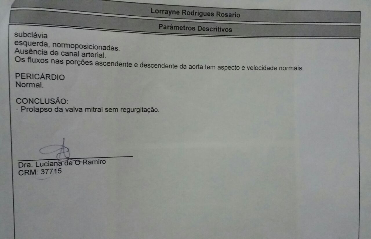 A jovem foi submetida a um exame de ecocardiograma, que constatou o sopro no coração (foto ao lado). “A médica disse que eu teria de refazer o exame de seis em seis meses para acompanhar o desenvolvimento do problema, pois existia uma possibilidade grande de ter uma arritmia cardíaca e, consequentemente, um infarto”, conta.