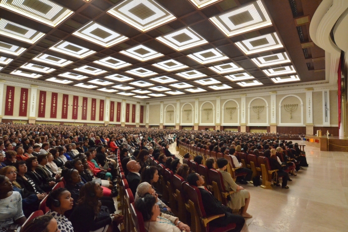 Já no Templo, os quase 10 mil convidados aguardavam o momento oficial do pronunciamento do bispo Edir Macedo, líder e fundador da Universal, que esteve à frente da cerimônia inaugural.