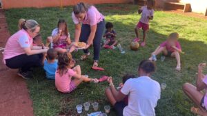 Além da reflexão, realizaram dinâmicas onde dividiram as idades em faixa etária para alcançar as crianças usando a sua linguagem. Logo após, fizeram brincadeiras e prepararam um lanchinho todo especial, assim sendo uma tarde de muita alegria.