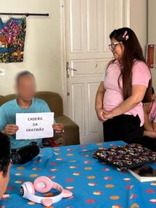 “Ao que você é grato?”. Essa foi a reflexão passada por meio da dinâmica “Cadeira da gratidão” realizada às terças e domingos em abrigos, residência inclusiva e na clínica de recuperação feminina. Tanto crianças, adolescentes e adultos participaram do momento. A iniciativa se dava ao se sentar na cadeira e em compartilhar com todos o motivo de ser grato pelo que se tem e o que há de vir.