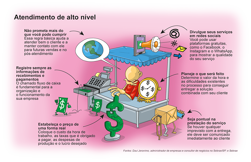 Para Davi Jeronimo, administrador de empresas e consultor de negócios no Sebrae/SP, quem quer prestar um serviço de qualidade precisa ter clareza quanto ao que vai ofertar. “O que ocorre, geralmente, é que o profissional promete a mais e, quando presta o serviço, acaba entregando menos e com qualidade duvidosa. O importante é que ele faça um bom planejamento dos seus serviços e cobre o preço justo e acordado para execução”, afirma.