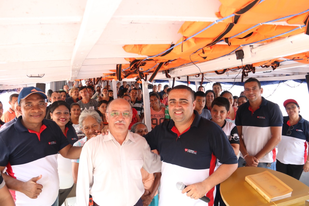 “É a única Universal flutuante em atividade no mundo. Toda quinta-feira e domingo à tarde, partimos para as comunidades em locais de difícil acesso. Muitas vezes, dentro de mata fechada”, conta o Pastor Glauber Moré, responsável pelo grupo de Evangelização (EVG) do Amazonas.